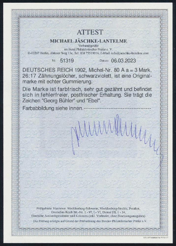 | Zusatzinformationen und Suchstichworte: | HBA 81. Auktion 11. - 13. Mai 2023 Los 833 (D) Deutsches Reich, Germania ohne WZ 1902, Deutsches Reich ohne Wz., 3 Mk., schwarzviolett, 26:17 Zähnungslöcher, tadellos postfrisches Kabinettstück, immer fehlende Marke, Altsign. und gepr. Jäschke-Lantelme mit neuem Fotoattest, Mi. 1800,-- Zuschlag 1.000,00 EUR |