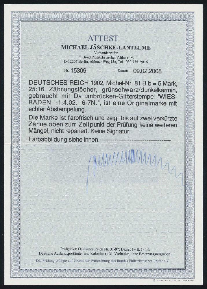 | Prüfgebiet: | Deutsches Reich 1871 - 1918 (Mi-Nr. 1 - 106) |