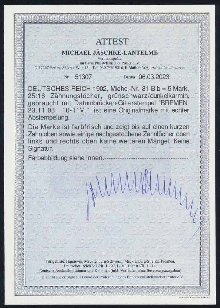 | Prüfer: | Jäschke-Lantelme, Michael (BPP (Bund Philatelistischer Prüfer)) |