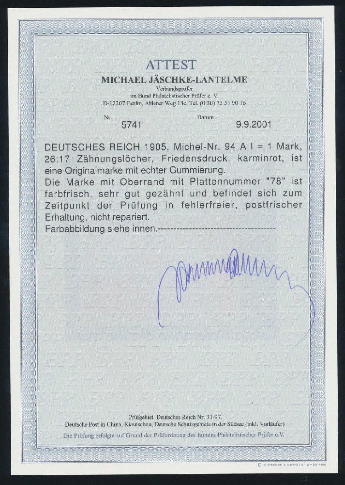 | Prüfer: | Jäschke-Lantelme, Michael (BPP (Bund Philatelistischer Prüfer)) |