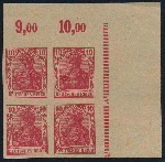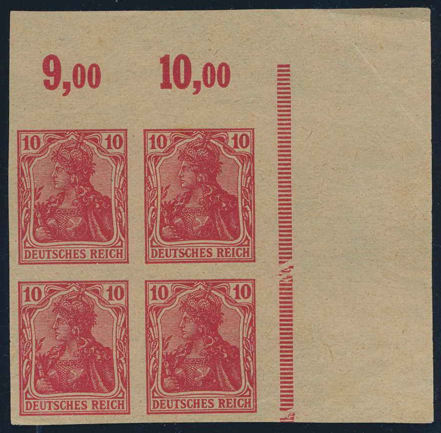 | Zusatzinformationen und Suchstichworte: | HBA 81. Auktion 11. - 13. Mai 2023 Los 857 (D) Deutsches Reich, Germania mit WZ 1915, Germania, Versuchsdruck, 10 Pfg., dunkelkarminrot, ungezähnter Viererblock aus der rechten, oberen Bogenecke, ungebraucht ohne Gummierung, wie verausgabt, breitrandig geschnitten, rechte, obere Marke ganz leichter Braunfleck, im Rand zwei Büge, sonst tadellose Kabinetterhaltung, ohne Signaturen und gepr. Jäschke-Lantelme mit neuem Fotoattest, Mi. 480,-- Zuschlag 90,00 EUR |