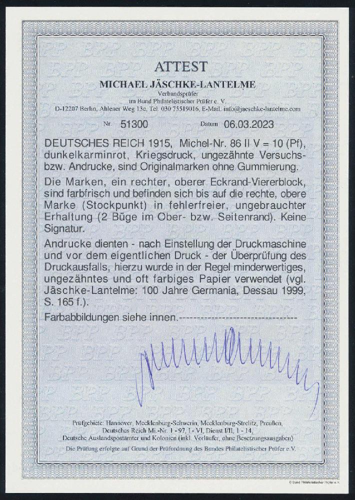 | Prüfer: | Jäschke-Lantelme, Michael (BPP (Bund Philatelistischer Prüfer)) |