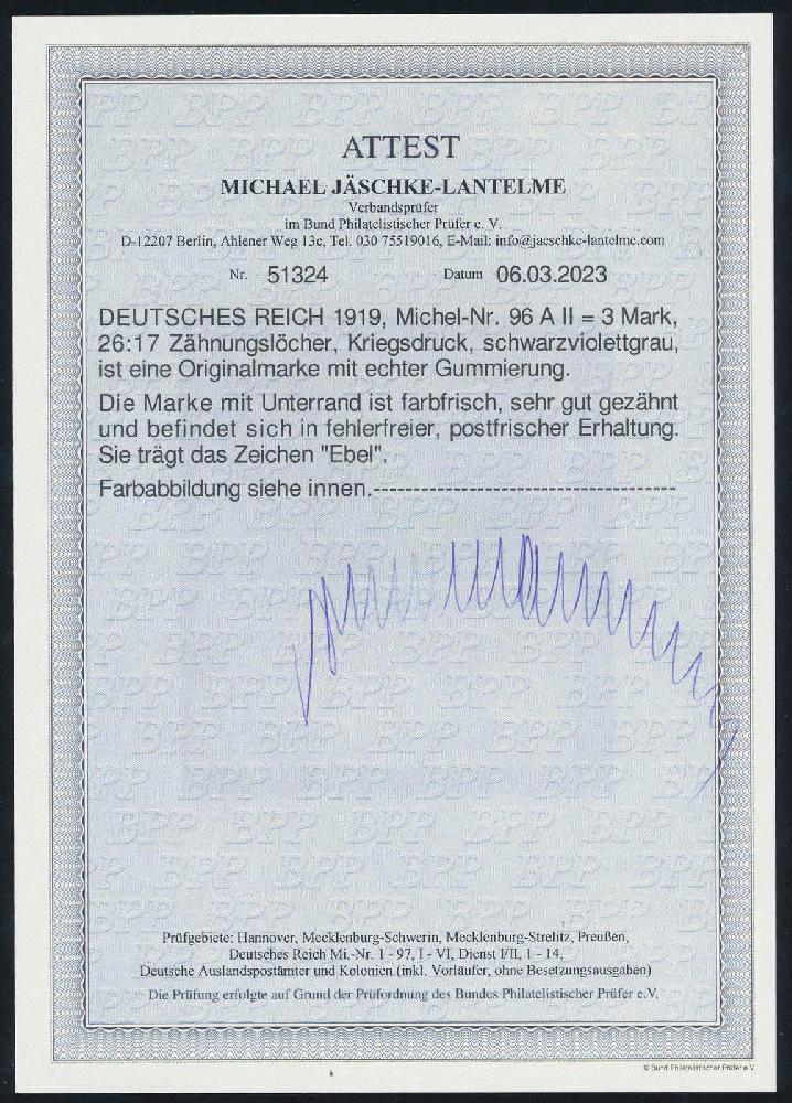 | Prüfer: | Jäschke-Lantelme, Michael (BPP (Bund Philatelistischer Prüfer)) |