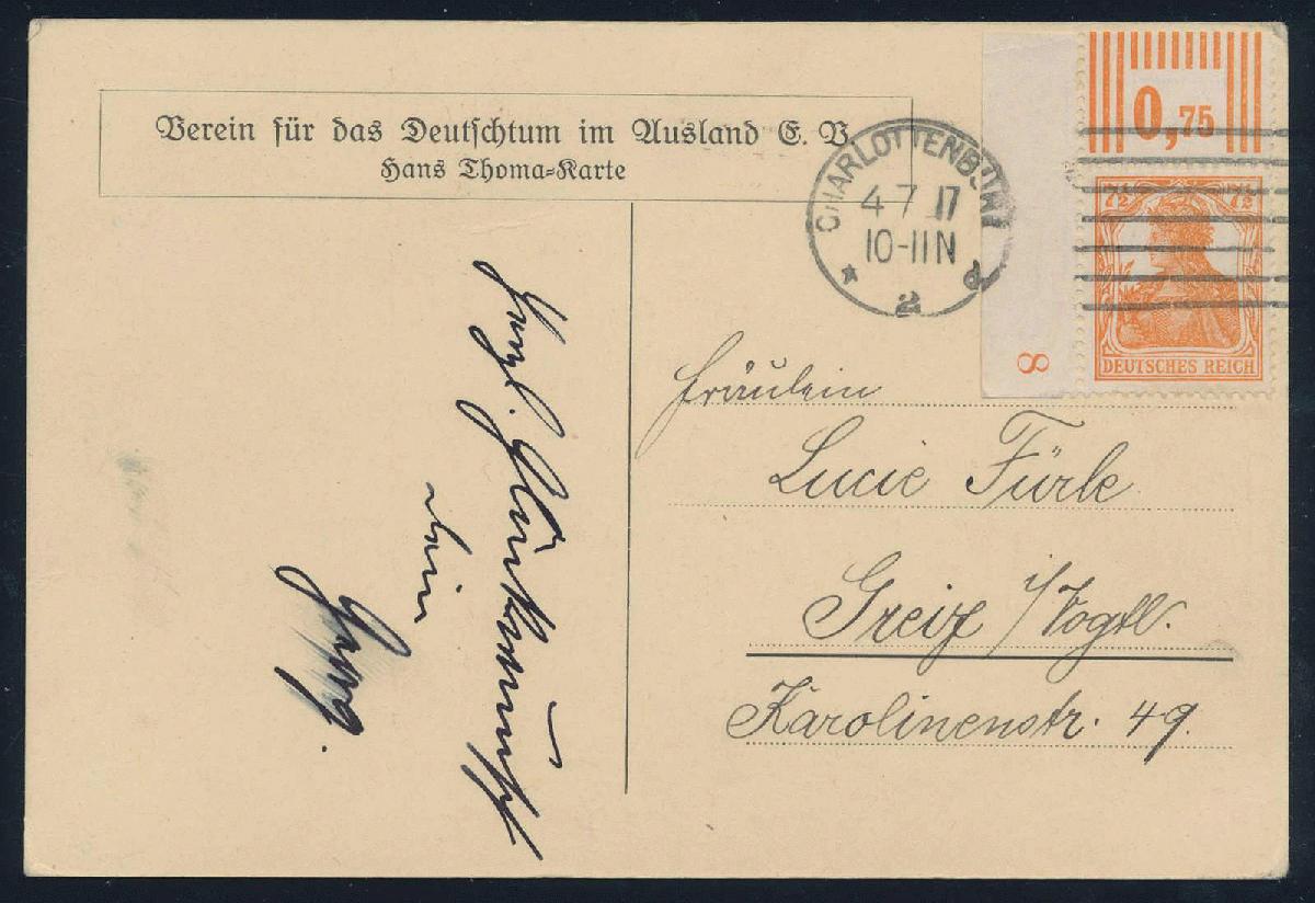 | Zusatzinformationen und Suchstichworte: | HBA 81. Auktion 11. - 13. Mai 2023 Los 865 (D) Deutsches Reich, Germania mit WZ 1916, Germania, 7 1/2 Pfg., orange, aus der linken, oberen Bogenecke mit Walzendruck-Oberrand, als portogerechte Einzelfrankatur auf Ansichtskarte von "CHARLOTTENBURG 4 7 17", adressiert nach Greiz, tadellose Kabinetterhaltung,, winzige Gebrauchsspuren in der Karte sind bedarfsbedingt, laut Attest von 2017 ist eine Einzelfrankatur dieser Ausgabe mit Oberrand bisher nur in diesem Stück bekannt, gepr. Weinbuch mit Fotoattest, Mi. mind. 3000,--+++ Zuschlag 750,00 EUR |