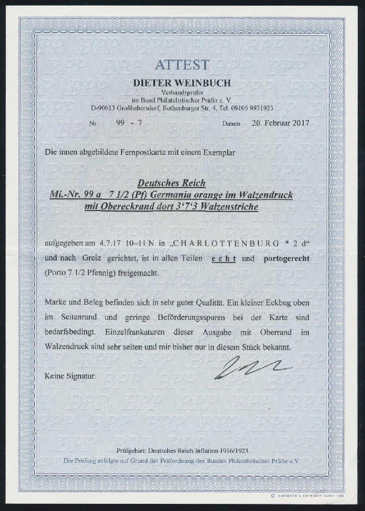 | Prüfer: | Weinbuch, Dieter (BPP (Bund Philatelistischer Prüfer)) |
