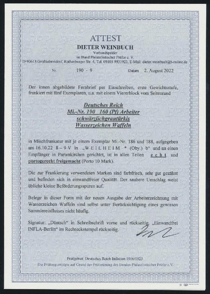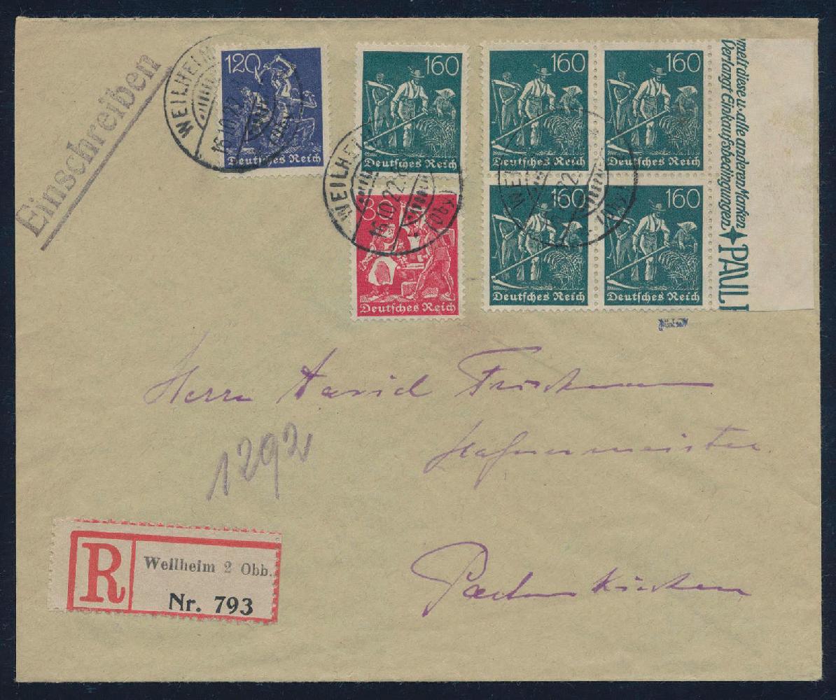 | Zusatzinformationen und Suchstichworte: | HBA 81. Auktion 11. - 13. Mai 2023 Los 906 (D) Deutsches Reich, 1918/23 Inflationsausgaben 1922, Arbeiter mit Wasserzeichen Waffeln, 160 Pfg., Viererblock vom Seitenrand und Einzelstück, in Mischfrankatur mit gleicher Ausgabe 80 Pfg. und 120 Pfg., auf portogerechtem R-Fernbrief von "WEILHEIM (OBY) b 16.10.22" nach Partenkirchen mit Ankunftsstempel, tadellose Kabinetterhaltung, seltene Frankatur, gepr. Infla Berlin, Dr. Düntsch und gepr. Weinbuch mit neuem Fotoattest, Mi. 1345,-- Ausruf 250,00 EUR |