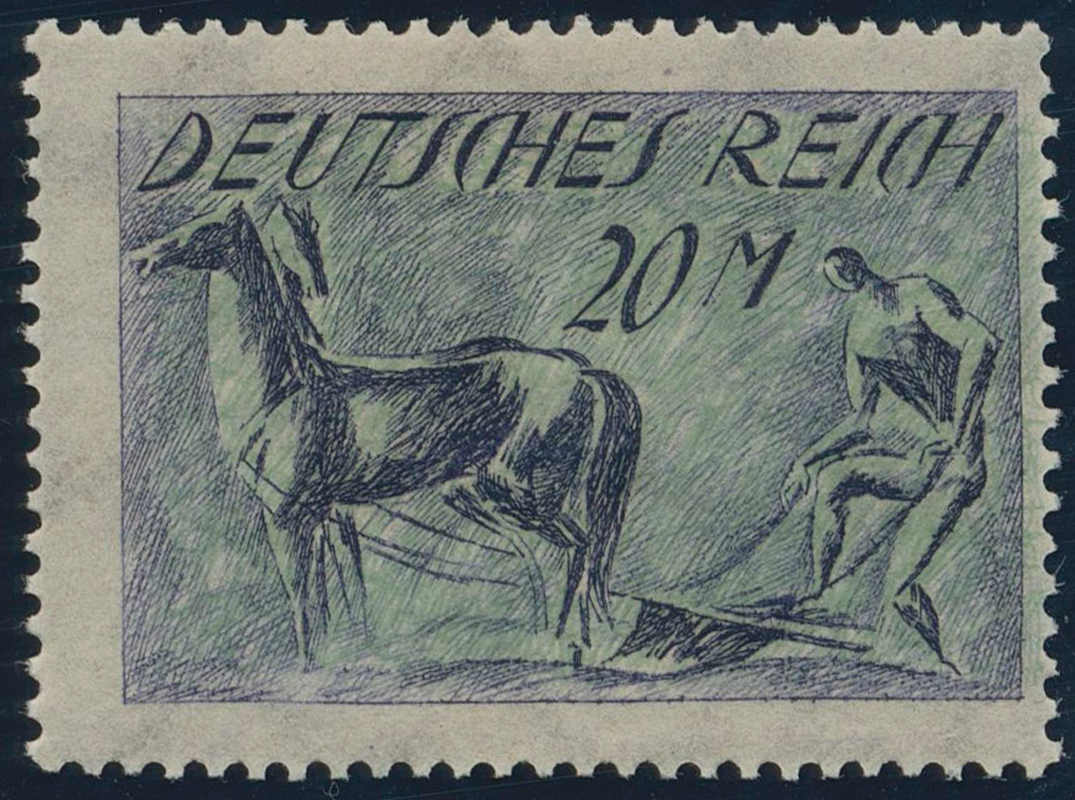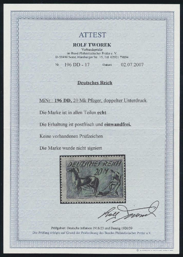 | Zusatzinformationen und Suchstichworte: | HBA 81. Auktion 11. - 13. Mai 2023 Los 910 (D) Deutsches Reich, 1918/23 Inflationsausgaben 1922, Pflüger, 20 Mk., dunkellilaultramarin/hellgraugrün, Doppeldruck des Unterdrucks, tadellos postfrisches Kabinettstück, seltene Marke, ohne Signaturen und gepr. Tworek mit Fotoattest, Mi. 800,-- Ausruf 160,00 EUR |