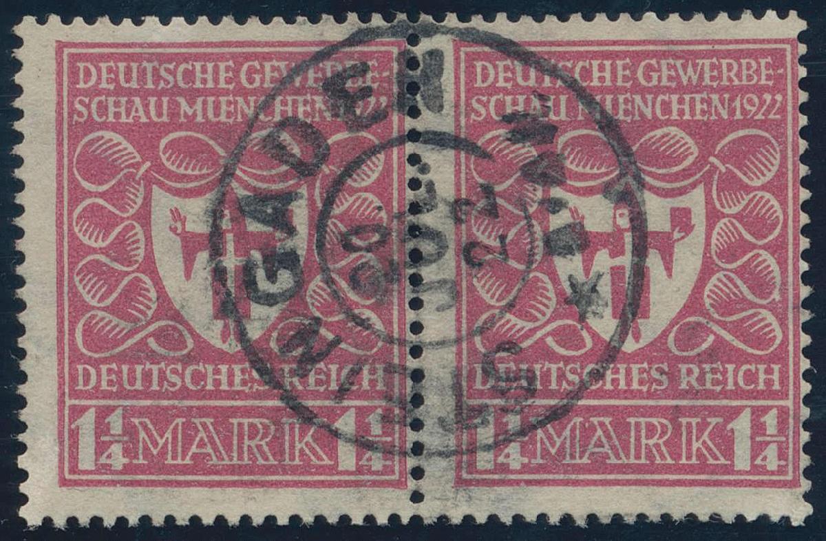 | Zusatzinformationen und Suchstichworte: | HBA 81. Auktion 11. - 13. Mai 2023 Los 912 (D) Deutsches Reich, 1918/23 Inflationsausgaben 1922, Gewerbeschau München, 1 1/4 Mk., lebhaftrötlichkarmin (hellilarosa), waagerechtes Paar, sauber echt und zeitgerecht gestempeltes Kabinettstück, gepr. Infla Berlin, Dr. Oechsner und gepr. Weinbuch mit Fotoattest, Mi. 800,-- Ausruf 160,00 EUR |