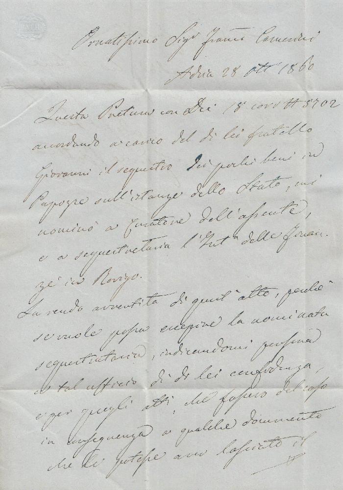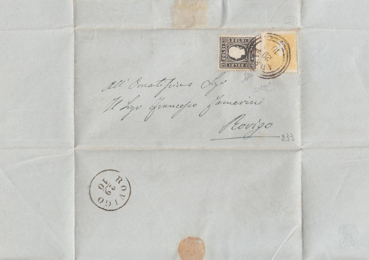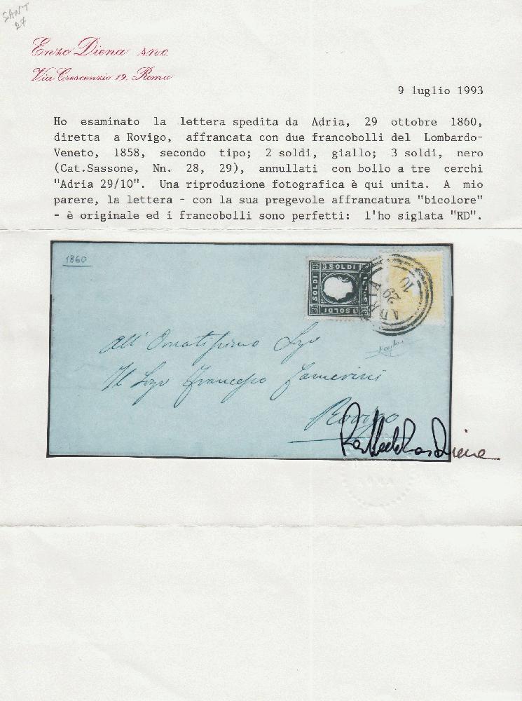 | Zusatzinformationen und Suchstichworte: | Versuch einer Übersetzung: 9. Juli 1993 Ich habe den nach Rovigo gerichteten Brief von Adria vom 29. Oktober 1860 geprüft, frankiert mit zwei Briefmarken aus Lombardei-Venetien, 1858, zweiter Typ; 2 Soldi, gelb; 3 Soldi, schwarz (Kat.Sassone, Nr. 28, 29), gestempelt mit Dreikreisstempel "Adria 29/10". Eine fotografische Reproduktion ist hier vereint. Meiner Meinung nach ist der Brief - mit seinem feinen "zweifarbigen" Porto - original und die Briefmarken sind perfekt: Ich habe ihn mit "RD" signiert. |