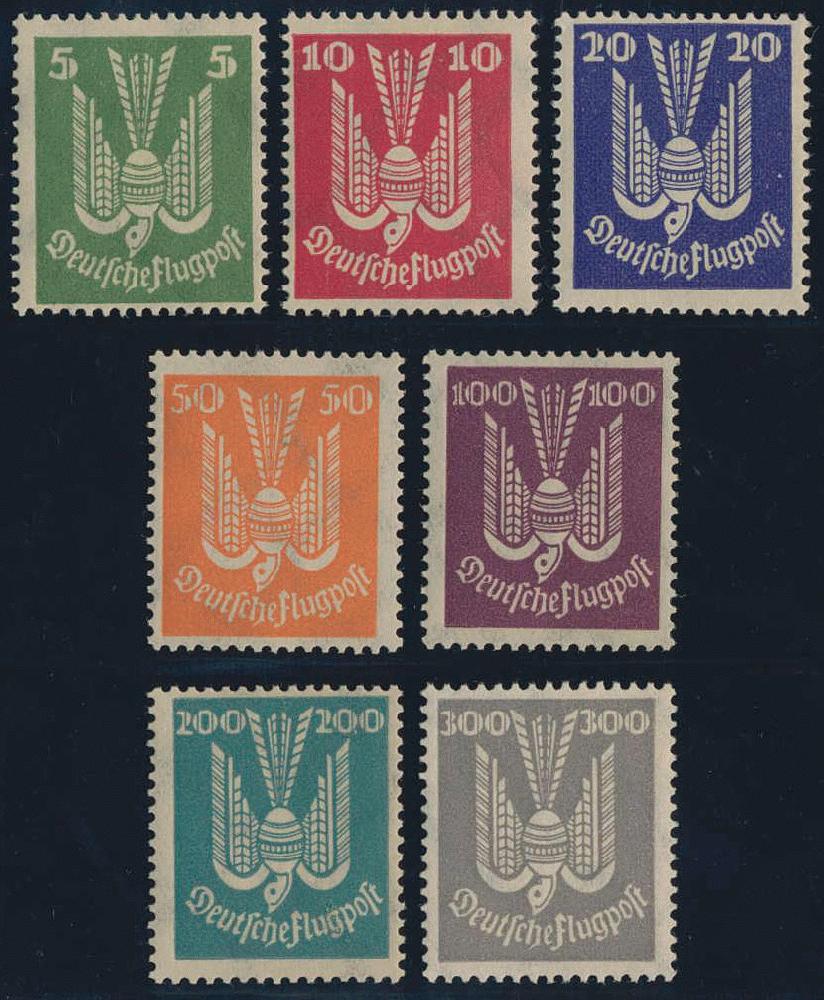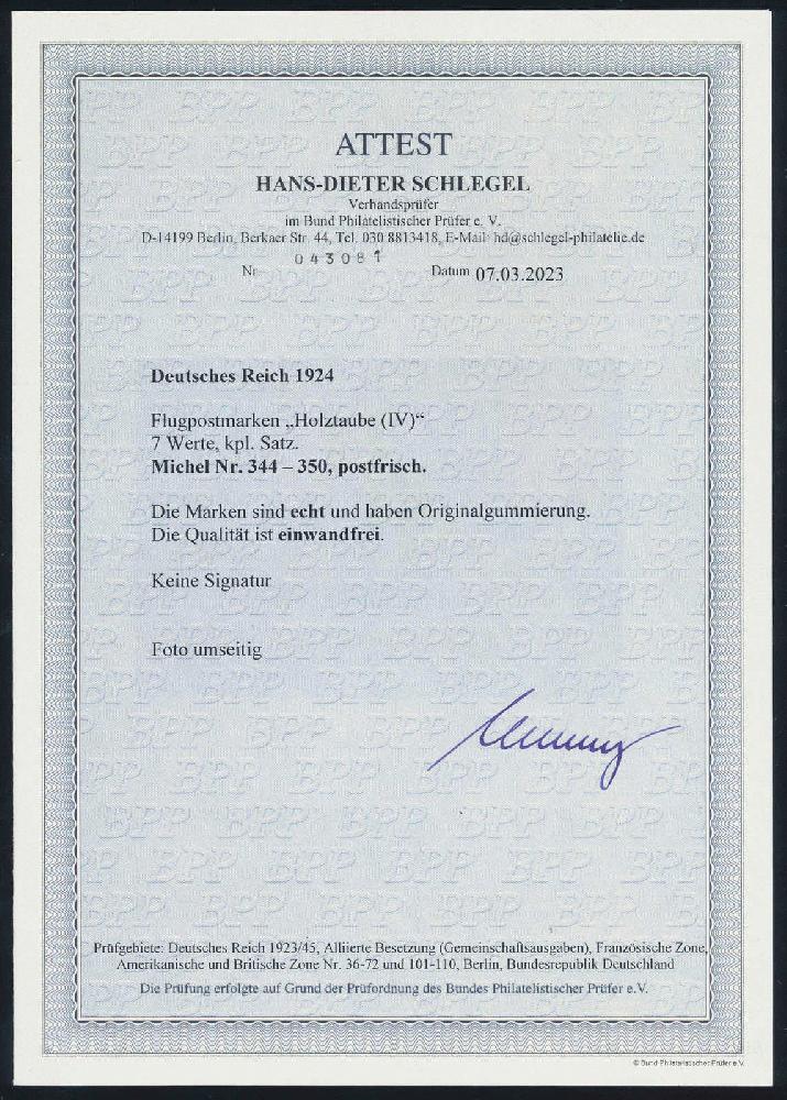 | Zusatzinformationen und Suchstichworte: | HBA 81. Auktion 11. - 13. Mai 2023 Los 938 (D) Deutsches Reich, 1923/32 Weimarer Republik 1924, Flugpost Holztaube, 7 W. kpl., tadellos postfrischer Kabinettsatz, ohne Signaturen und gepr. Schlegel mit neuem Fotoattest, Mi. 1500,-- Ausruf 370,00 EUR |