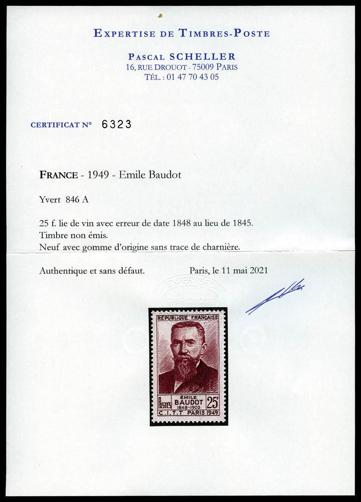 | Zusatzinformationen und Suchstichworte: | La Postale Philatélie 42. Auktion 7. Juli 2023 Los 1348 Frankreich 1901-2000 N°846A, NON EMIS: Baudot, ERREUR DE DATE 1848 AU LIEU DE 1845, SUP. R.R. (signé/certificats) Qualité: ** Cote: 4350 euros Ausruf 1.450,00 EUR |
