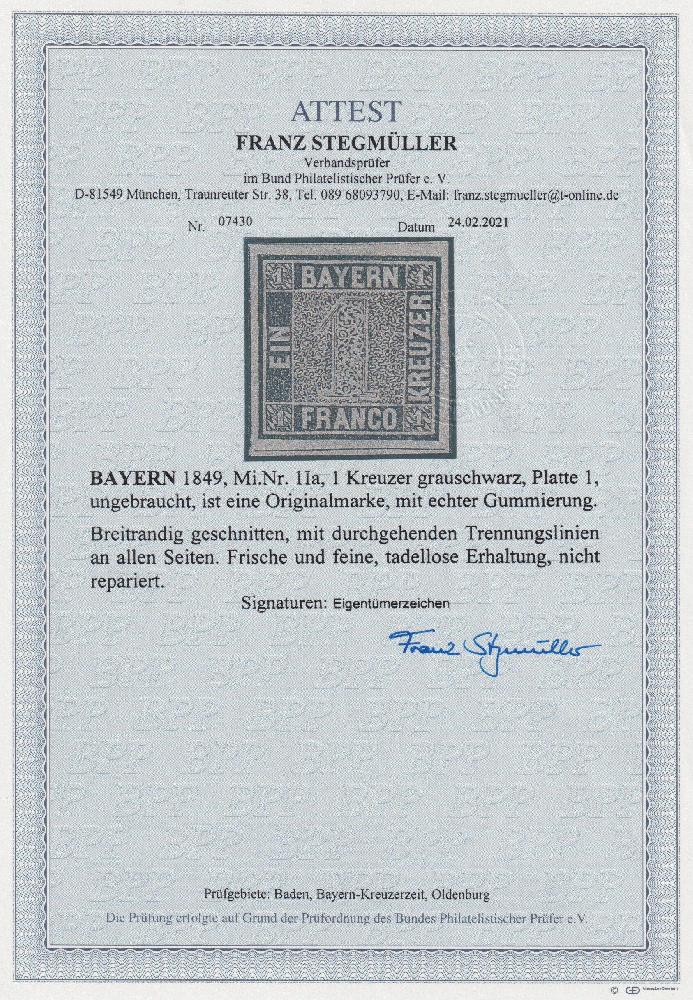 | Zusatzinformationen und Suchstichworte: | Südphila Peter Feuser 98. Auktion 13. Mai 2023 Los 180 Altdeutschland Bayern 1 Kr. grauschwarz, Platte 1, breitrandiges ungebr. Kabinettstück, Attest Stegmüller Zuschlag 820,00 EUR |