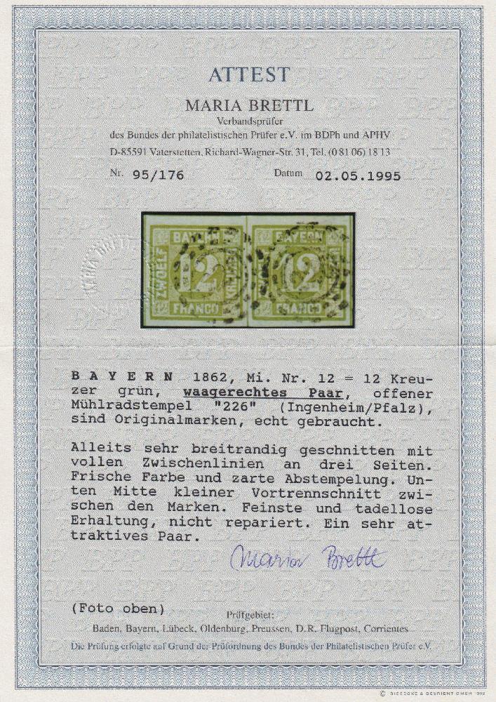 | Zusatzinformationen und Suchstichworte: | Südphila Peter Feuser 98. Auktion 13. Mai 2023 Los 294 Altdeutschland Bayern 12 Kr. grün, allseits sehr breitrandig geschnittenes Luxuspaar (volle Schnittlinien an drei Seiten) mit oMR "226" Ingenheim, ein entzückendes Paar, Attest Brettl Zuschlag 360,00 EUR |