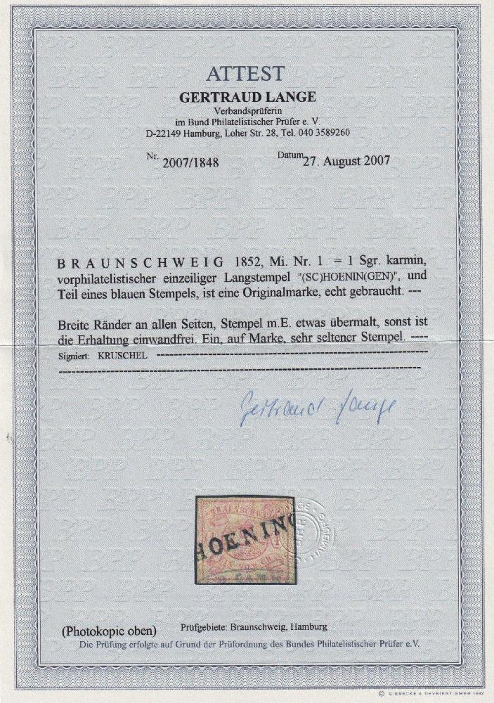| Prüfgebiet: | Altdeutschland Braunschweig |