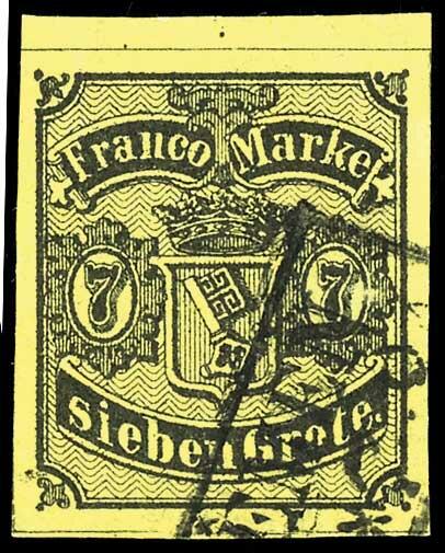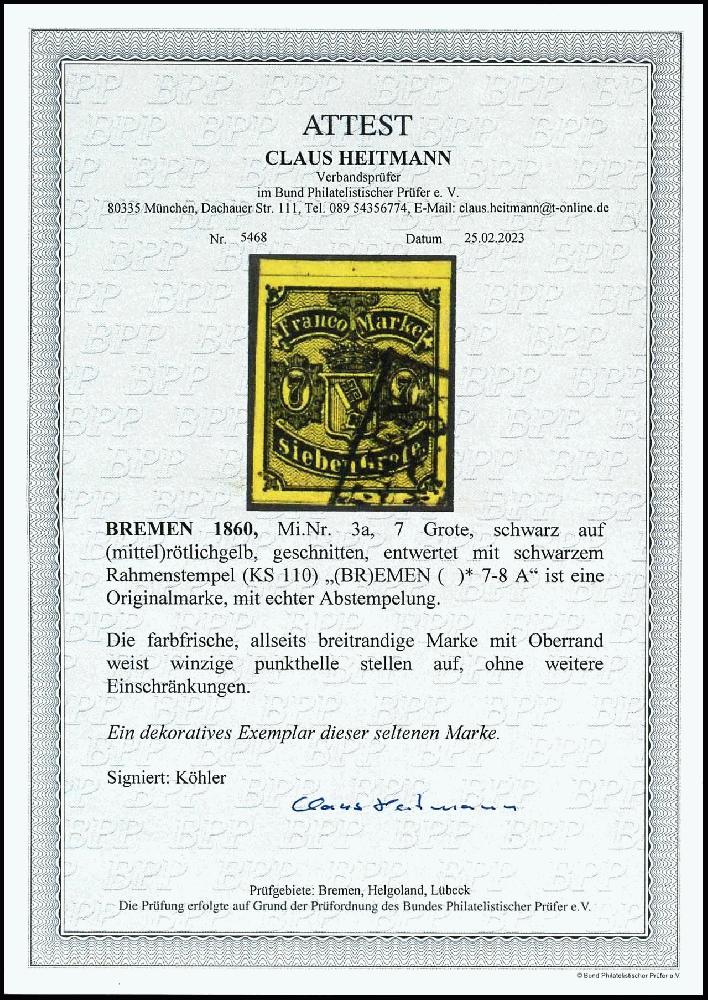 | Zusatzinformationen und Suchstichworte: | Dr. Reinhard Fischer 192. Auktion 19. - 20. Mai 2023 Los 79 Altdeutschland Bremen 7 Gr. auf mittelrötlichgelb, allseits breitrandig mit Oberrand und farbfrisch, gestempelt "BREMEN" bis auf winzige punkthelle Stellen tadellos, dekoratives Exemplar dieser seltenen Marke, sign. Köhler, Fotoattest Heitmann BPP, Mi. 900.- Ausruf 200,00 EUR |