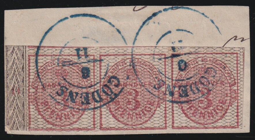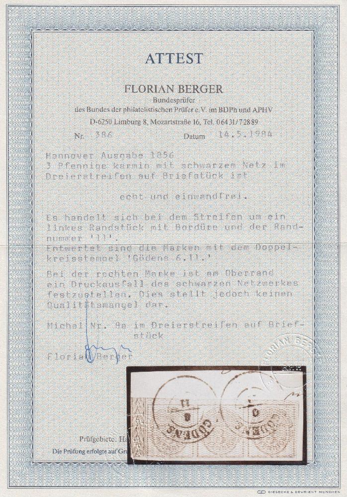 | Zusatzinformationen und Suchstichworte: | Südphila Peter Feuser 98. Auktion 13. Mai 2023 Los 490 Altdeutschland Hannover 3 Pfg. karmin/schwarz, voll- bis breitrandiger Kabinett-Dreierstreifen auf Briefstück, oben und rechts Nebenmarken, links 7 mm Bordürenrand mit Reihenzahl "11", klarer K2 GÖDENS, Attest Berger, sign. Drahn, Köhler, Kruschel Ausruf 800,00 EUR |