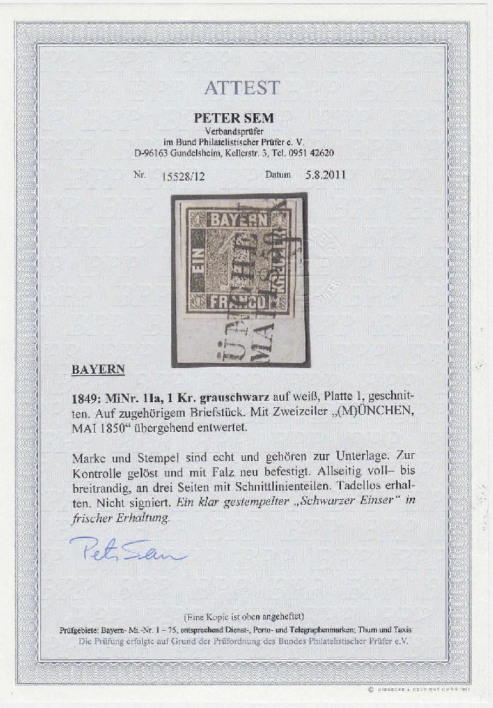 | Zusatzinformationen und Suchstichworte: | 159. und 160. Teutoburger Münzauktionen 11. - 16. September 2023 Briefmarken, Deutschland, Altdeutschland, Bayern 1 Kr. ,,Schwarzer Einser" 1849, sauber entwertet auf zugehörigem Briefstück mit dem Zweizeiler ,,MÜNCHEN, MAI 1850". Allseits voll- bis breitrandig, an drei Seiten mit Schnittlinienteilen. Tadellos erhalten. Fotoattest Sem BPP (Ein klar gestempelter ,,Schwarzer Einser" in frischer Erhaltung) Ausruf 1.350,00 EUR |