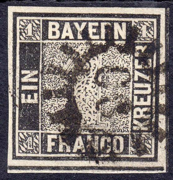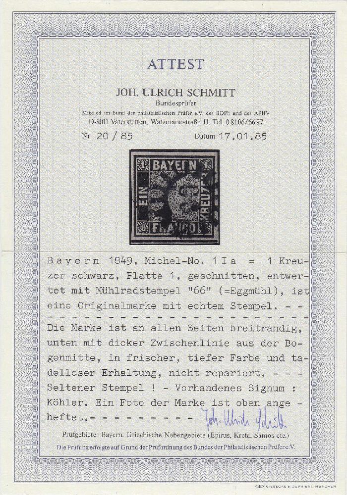 | Zusatzinformationen und Suchstichworte: | 159. und 160. Teutoburger Münzauktionen 11. - 16. September 2023 Los 4699 Altdeutschland Bayern 1 Kreuzer Freimarke (Schwarzer Einser) 1849, gestempelte Erhaltung. Die Marke ist an allen Seiten breitrandig, unten mit dicker Zwischenlinie aus der Bogenmitte, in frischer, tiefer Farbe und tadelloser Erhaltung, nicht repariert. Seltener Mühlradstempel ,,66 EGGMÜHL". Fotoattest Schmitt BPP Ausruf 1.250,00 EUR |