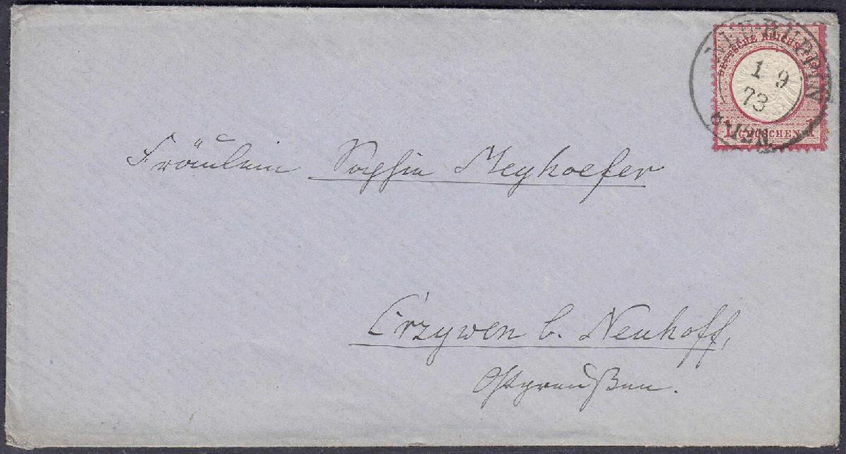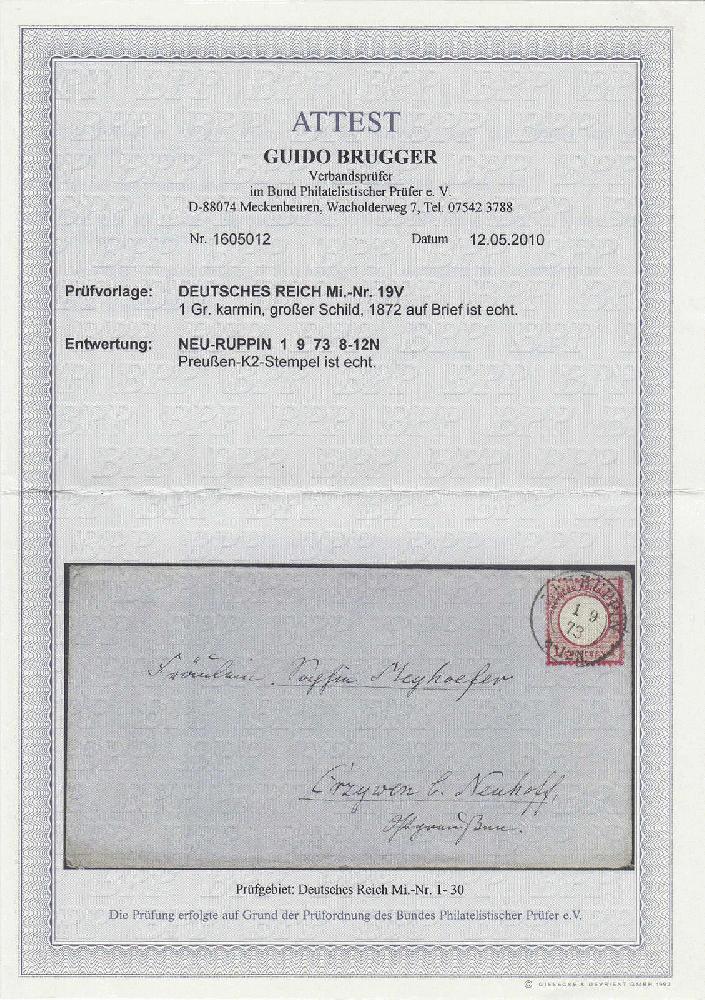| Zusatzinformationen und Suchstichworte: | 159. und 160. Teutoburger Münzauktionen 11. - 16. September 2023 Los 4714 Deutsches Reich, 1872 Grosser Brustschild 1 Gr. großer Brustschild 1872, portogerechte Einzelfrankatur, entwertet mit dem Preußen-K2-Stempel ,,NEU-RUPPIN 1 9 73 8-12N", die Marke hat den Plattenfehler ,,V" (gebrochenes ,,N" von Groschen), Format L 15. Fotoattest Brugger BPP Ausruf 50,00 EUR |