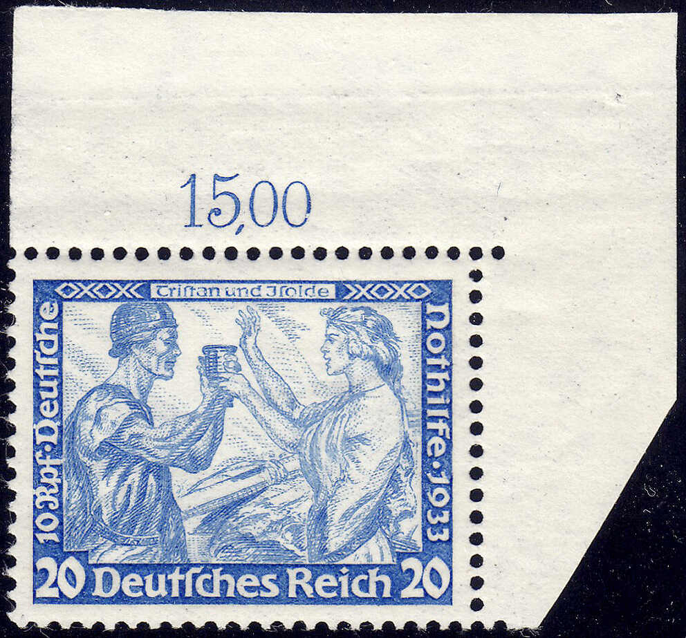 | Zusatzinformationen und Suchstichworte: | 159. und 160. Teutoburger Münzauktionen 11. - 16. September 2023 Los 4762 Deutsches Reich, 1933/45 Drittes Reich 20 Pf. Wagner (Tristan und Isolde) 1933, gezähnt ,,B", postfrisches Eckrandstück aus der rechten oberen Bogenecke. Fotoattest Schlegel BPP >echt und einwandfrei<. Mi. (Handbuch-Bogenecken) 2.100,-€ Ausruf 450,00 EUR |