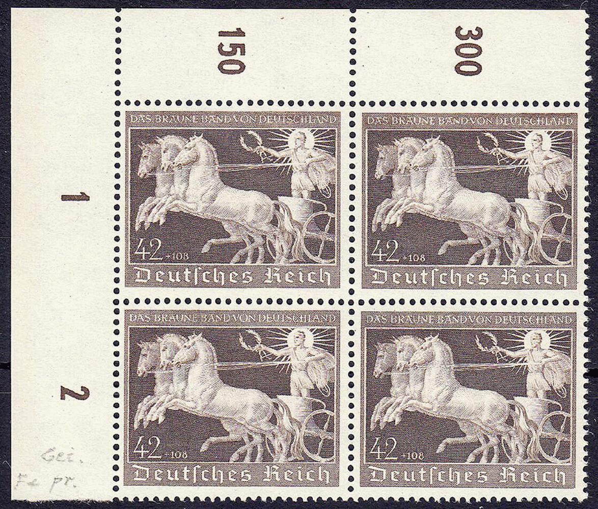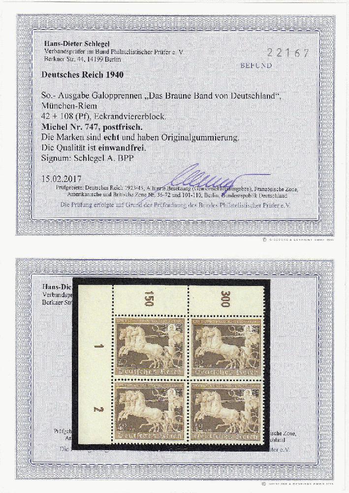 | Zusatzinformationen und Suchstichworte: | 159. und 160. Teutoburger Münzauktionen 11. - 16. September 2023 Los 4778 Deutsches Reich, 1933/45 Drittes Reich 42+108 Pf. Galopprennen (Braune Band) 1940, postfrische Luxusviererblock aus der linken oberen Bogenecke, die Ränder sind ebenfalls tadellos postfrisch, ungefaltet und unbeschriftet. Fotobefund Schlegel BPP >einwandfrei<. Mi. 540,-€ Ausruf 130,00 EUR |