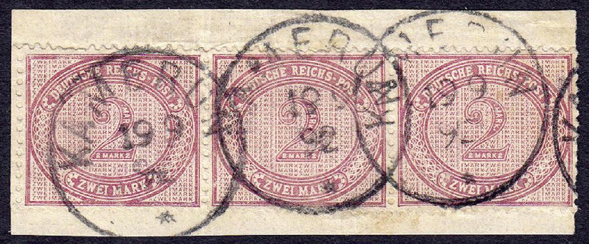 | Zusatzinformationen und Suchstichworte: | 159. und 160. Teutoburger Münzauktionen 11. - 16. September 2023 Los 4892 Deutsche Kolonien Kamerun 2 M. Vorläufer Kamerun 1890, waagerechter 3er-Streifen auf Briefstück, entwertet ,,KAMERUN 19/9/92". Es handelt sich um einen Ausschnitt aus einem übergewichtigen Leinenbrief, jede Marke ist einzeln voll und echt entwertet. Die Einheit zeigt, bis auf einige kurze Zähne, keine weiteren Mängel. Fotoattest Steuer BPP (2019). Mi. 600,-€ Ausruf 100,00 EUR |