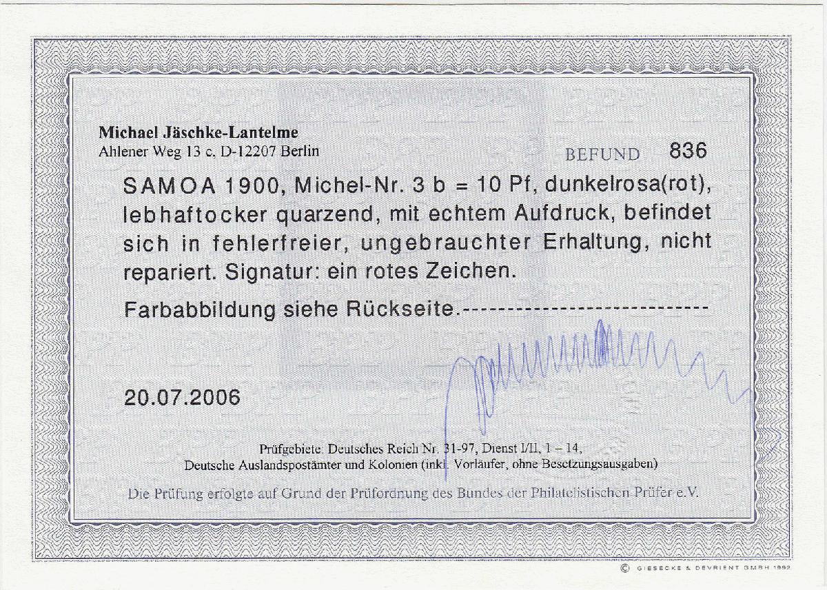 | Prüfgebiet: | Deutsche Kolonien Samoa |