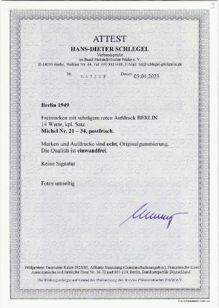 | Zusatzinformationen und Suchstichworte: | 159. und 160. Teutoburger Münzauktionen 11. - 16. September 2023 Los 5068 Berlin 2 Pf. - 2 M. Rotaufdruck 1949, kompletter Satz in postfrischer Luxuserhaltung, unsigniert. Fotoattest Schlegel BPP (2023) >Die Erhaltung ist einwandfrei<. Mi. 1.400,-€ Ausruf 300,00 EUR |