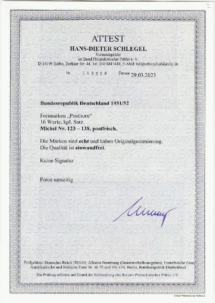 | Zusatzinformationen und Suchstichworte: | 159. und 160. Teutoburger Münzauktionen 11. - 16. September 2023 Los 5154 Bundesrepublik Deutschland 2 Pf. - 90 Pf. Posthorn 1951/52, kompletter Satz in postfrischer Luxuserhaltung, unsigniert. Fotoattest Schlegel BPP (März 2023) >einwandfrei<. Mi. 2.200,- Euro Ausruf 500,00 EUR |