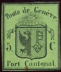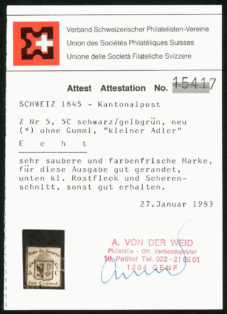 | Zusatzinformationen und Suchstichworte: | Briefmarken Helvetia 46. Live-Auktion 13. Mai 2023 Los 14 Die Kantonalposten Genf 1845: 5 C. gelbgrün, kleiner Adler, ungebraucht ohne Gummi, vollrandig, für diese Marke gut gerandet; u.r. kleiner Vortrennschnitt, ansonsten in bester Erhaltung; Attest v.d.Weid; Kat: 4600.- Zuschlag 750,00 CHF |