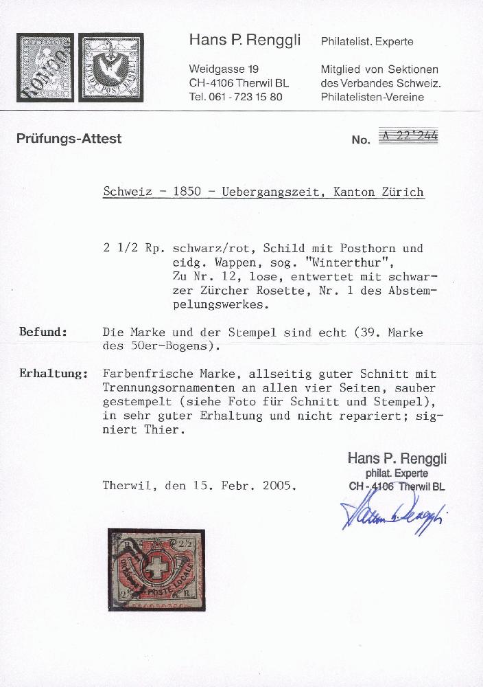 | Zusatzinformationen und Suchstichworte: | Briefmarken Helvetia 46. Live-Auktion 13. Mai 2023 Los 20 Schweiz Übergangszeit, Waadt, Neuenburg, Winterthur 1850: 2½ Rp. Winterthur, Bogenfeld 39; sauber vollrandig mit Trennornamenten an allen Seiten, farbfrisch und sauber entwertet mit schwarzer Zürcher Rosette; sign. Thier, Attest Renggli (2005), Kat: 5400.- Zuschlag 1.800,00 CHF |