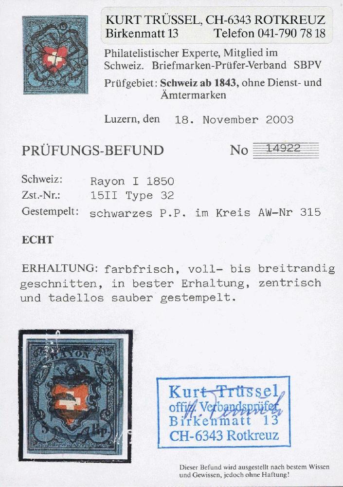 | Zusatzinformationen und Suchstichworte: | Briefmarken Helvetia 46. Live-Auktion 13. Mai 2023 Los 34 Schweiz Rayon Rayon I dunkelblau, Type 32, voll- bis breitrandig, perfekt entwertet Aarauer mit P.P. im Kreis (AW Nr. 315); einwandfrei mit Befund Trüssel; Kat: 800.- Ausruf 150,00 CHF |
