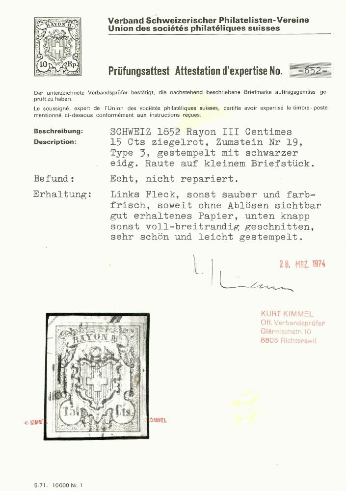 | Prüfer: | Kimmel, Kurt (SBPV / ASEP (Schweizerischer Briefmarken-Prüfer-Verband)) |