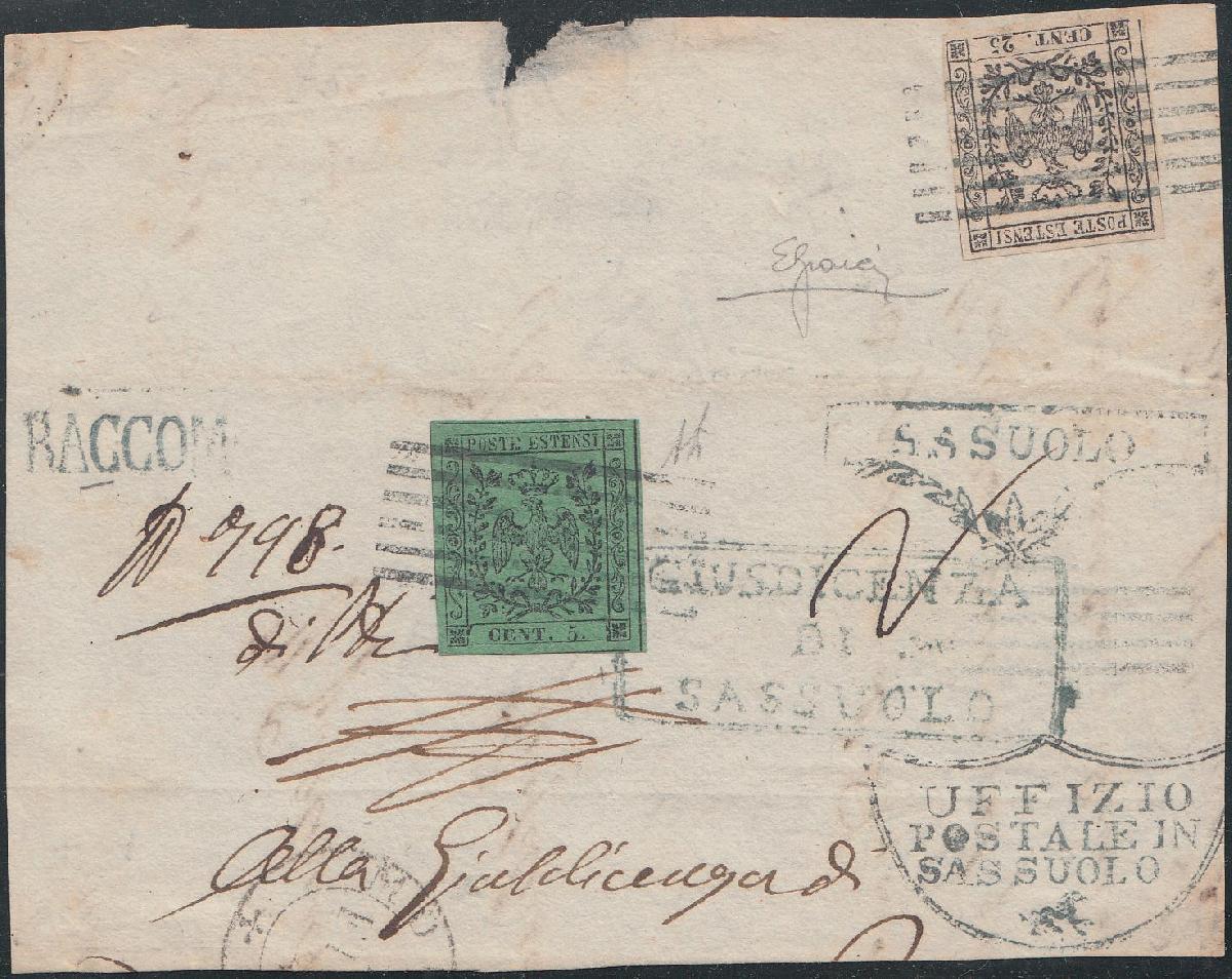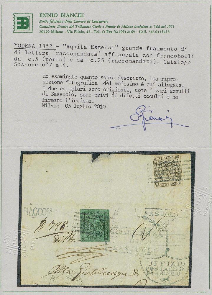 | Zusatzinformationen und Suchstichworte: | Versuch einer Übersetzung: MODENA 1852 - "Adler von Este" großes Fragment eines eingeschriebenen Briefes, frankiert mit Briefmarken von 5 Centesimi (Porto) und 25 Centesimi (Einschreiben). Sassone Katalog Nr. 7 und 4. Ich habe das oben beschriebene untersucht, eine fotografische Reproduktion davon ist hier beigefügt. Die beiden Exemplare sind original, wie die verschiedenen Abstempelungen von Sassuolo, sie sind frei von versteckten Mängeln und ich habe das Ganze signiert. Mailand, den 5. Juli 2010 |