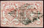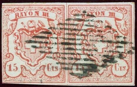 | Zusatzinformationen und Suchstichworte: | Briefmarken Helvetia 46. Live-Auktion 13. Mai 2023 Los 65 Schweiz Rayon 15 Cts. ziegelrot, waagrechtes Paar, Typen 9+10, MM II; ideal entwertet mit eidg. Raute; links angeschnitten, sonst rundum überrandig; mit 2 markanten PF (u.a.2.01); ausführliches Attest Hermann; Kat: 3800.- Ausruf 240,00 CHF |