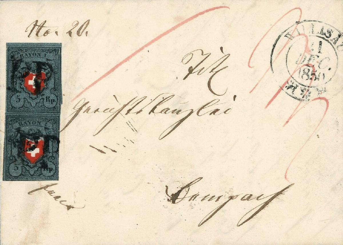 | Zusatzinformationen und Suchstichworte: | Briefmarken Helvetia 46. Live-Auktion 13. Mai 2023 Los 71 Schweiz Rayon Senkrechtes Paar Rayon I, tiefdunkelblau, Typen 7 und 15 auf R-Brief von Willisau nach Sempach; allseits gut gerandet, nur unten rechts leicht angeschnitten; sauber entwertet mit P.P. (AW Nr. 209), daneben Zierstempel von Willisau; Attest Trüssel; Kat: 6000.- Zuschlag 900,00 CHF |