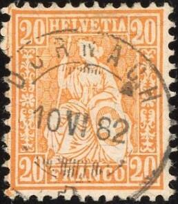 | Zusatzinformationen und Suchstichworte: | Briefmarken Helvetia 46. Live-Auktion 13. Mai 2023 Los 152 Schweiz Sitzende Helvetia gezähnt 20 Rp. orange auf Faserpapier, gest. DORNACH 10.VI.82; saubere Erhaltung; sign. Abt, Attest Hermann; Kat: 220.- Ausruf 40,00 CHF |