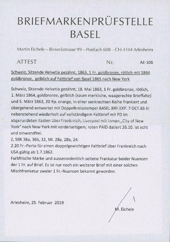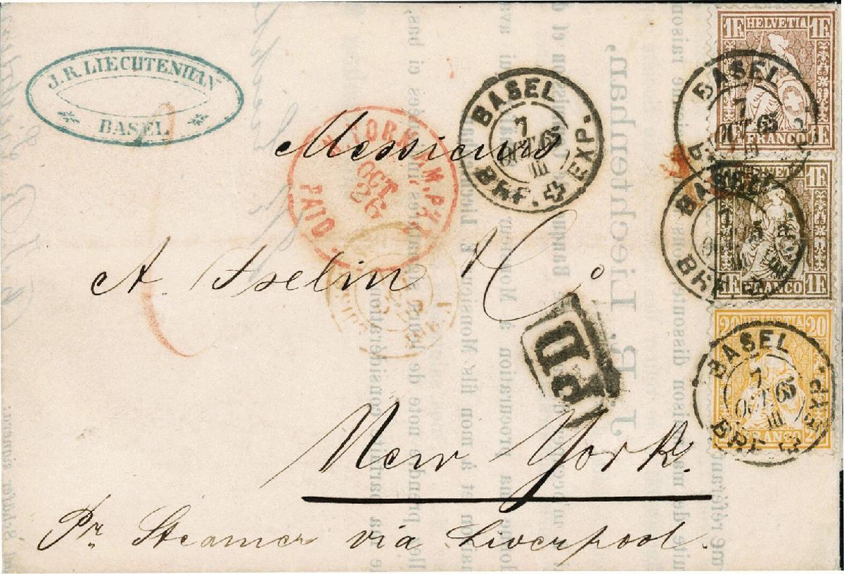 | Zusatzinformationen und Suchstichworte: | Briefmarken Helvetia 46. Live-Auktion 13. Mai 2023 Los 189 Schweiz Sitzende Helvetia gezähnt 1865: Frankatur mit 1 Fr. goldbronze rötlich und 1 Fr. goldbronze gelblich, zusammen mit 20 Rp. orange auf Faltbrief von Basel nach New York; klar gestempelt BASEL, dazu PD im Kasten und Ak-Stempel; extrem seltene Porto gerechte Frankatur (2. Gewichtstufe) in guter Erhaltung (nur Registraturbug) ex Sammlung A. Benz; es ist nur noch eine gleiche Frankatur aus der Seebub-Sammlung bekannt; Attest Eichele Zuschlag 2.400,00 CHF |