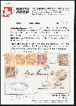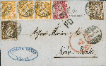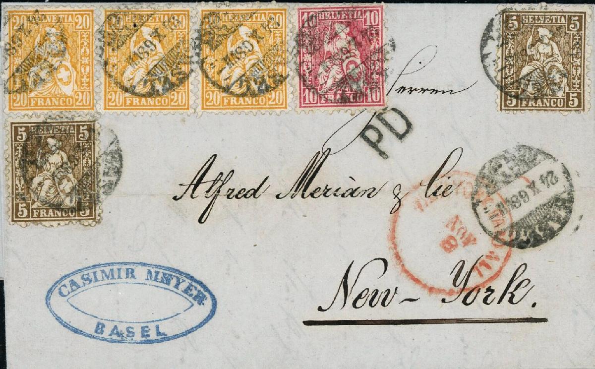 | Zusatzinformationen und Suchstichworte: | Briefmarken Helvetia 46. Live-Auktion 13. Mai 2023 Los 194 Schweiz Sitzende Helvetia gezähnt 1868: 80 Rp. Frankatur von Basel nach New York (an Alfred Merian & Co); 3x 20 Rp. orange, dazu 10 Rp. und 2x 5 Rp. braun; leicht gestempelte und dekorative Dreifarbenfrankatur; eine 5 Rp. Marke stark defekt, sonst in bester Erhaltung mit Attest Guinand Ausruf 600,00 CHF |