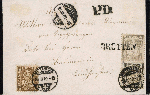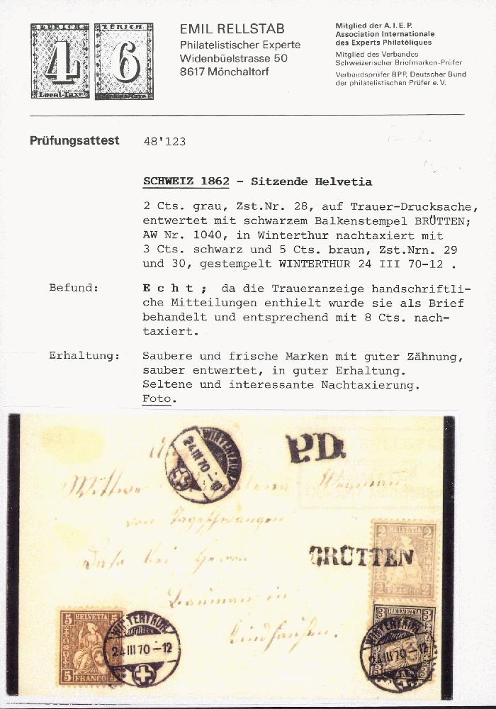 | Zusatzinformationen und Suchstichworte: | Briefmarken Helvetia 46. Live-Auktion 13. Mai 2023 Los 198 Schweiz Sitzende Helvetia gezähnt 1870: Dreifarbenfrankatur mit 2 Rp. grau, 3 Rp. schwarz und 5 Rp. braun auf Trauerbrief; 2 Rp. entwertet mit Stabstempel BRÜTTEN (AW Nr. 1040); das Drucksachen Porto wurde nicht anerkannt, deshalb eine 8 Rp. Taxierung in Winterthur; interessante und saubere Frankatur; Attest Rellstab Ausruf 400,00 CHF |
