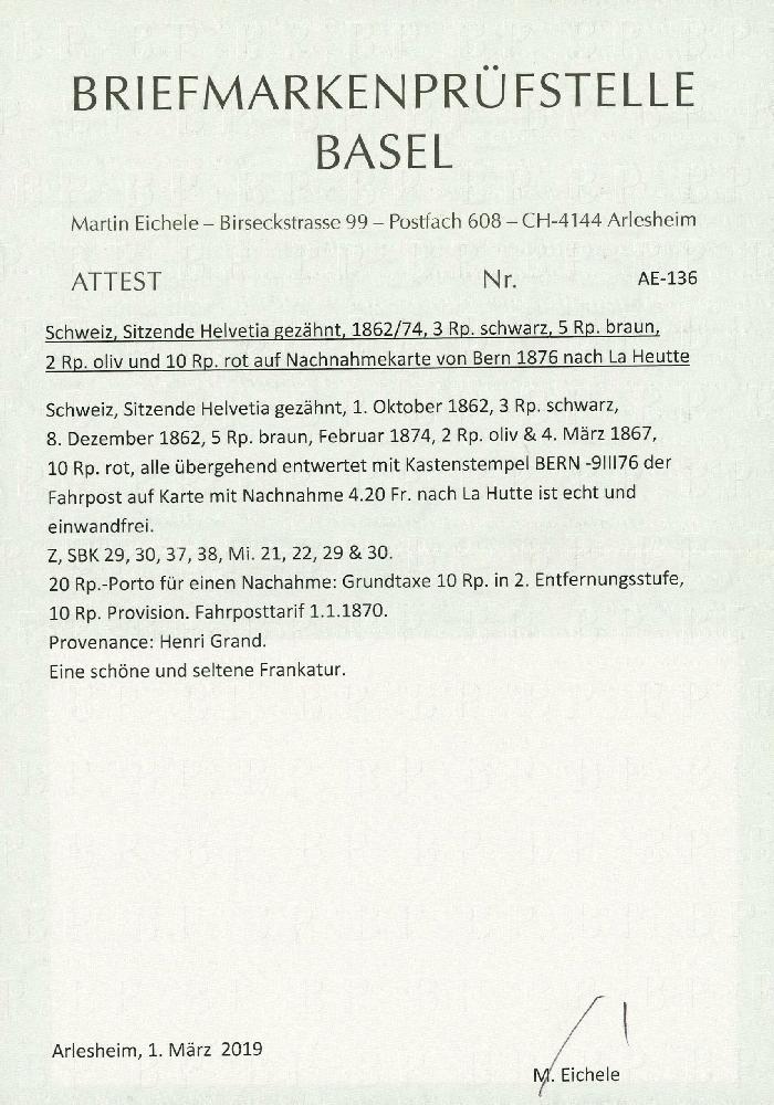 | Zusatzinformationen und Suchstichworte: | Briefmarken Helvetia 46. Live-Auktion 13. Mai 2023 Los 203 Schweiz Sitzende Helvetia gezähnt 1876: Sitz. Helvetia 4-Farbenfrankatur auf NN-Karte von Bern nach La Hutte; 3 Rp. schwarz und 5 Rp. braun, dazu 2 Rp. oliv und 10 Rp. rot als 20 Rp. NN-Porto; sauber enzwertet mit Fahrpost-Stempel BERN; seltene Frankatur aus der H. Grand-Sammlung; Attest Eichele Ausruf 500,00 CHF |