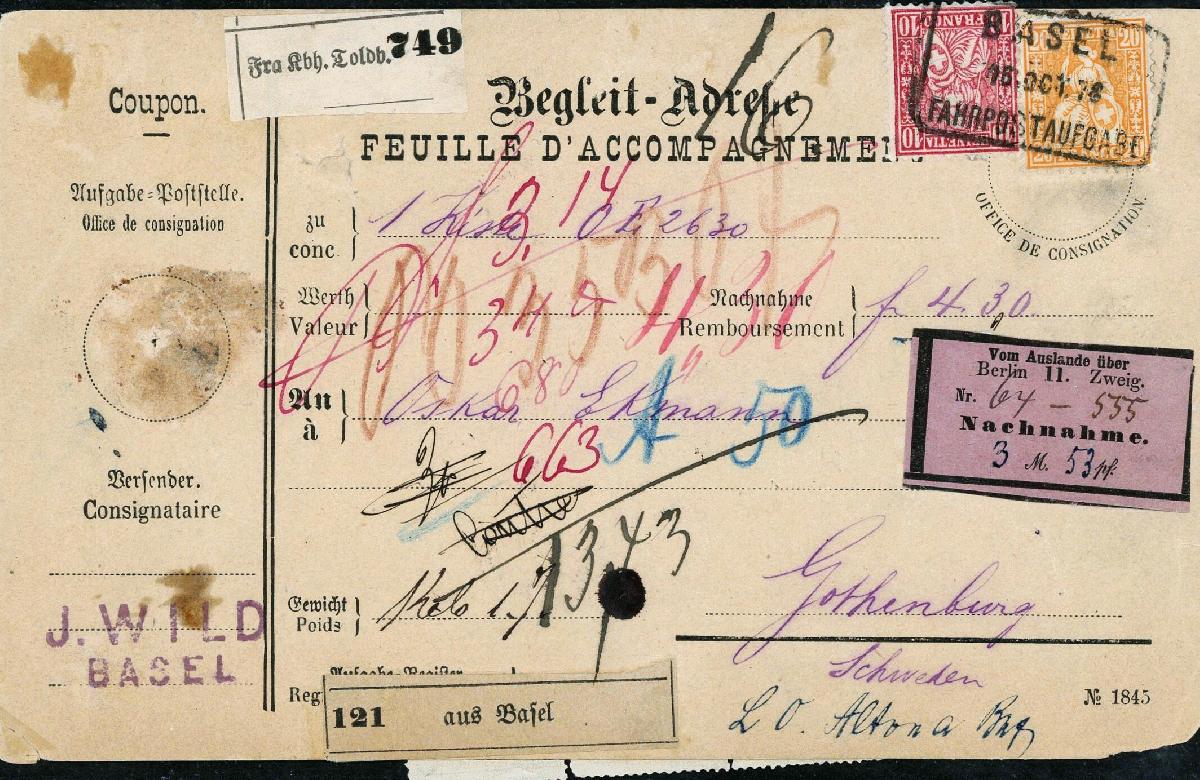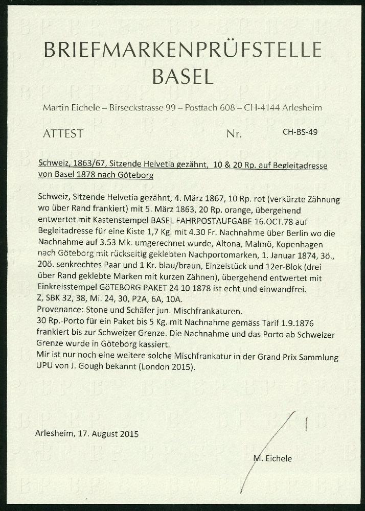 | Zusatzinformationen und Suchstichworte: | Briefmarken Helvetia 46. Live-Auktion 13. Mai 2023 Los 204 Schweiz Sitzende Helvetia gezähnt 1878: Begleitadresse für eine Kiste (1.7kg) von Basel nach Göteborg, frankiert bis Schweizer Grenze mit sitz. Helv. 10 Rp. rot und 20 Rp. orange, entwertet mit Fahrpoststempel von Basel; rückseitig hohe Schwedische Frankatur für Nachnahmebetrag und Inlandporto; spektakuläre Mischfrankatur in guter Erhaltung (nur eine weitere bekannt!), das Attest Eichele erwähnt kleine, für diese Seltenheit unbedeutende Mängel! Zuschlag 1.300,00 CHF |