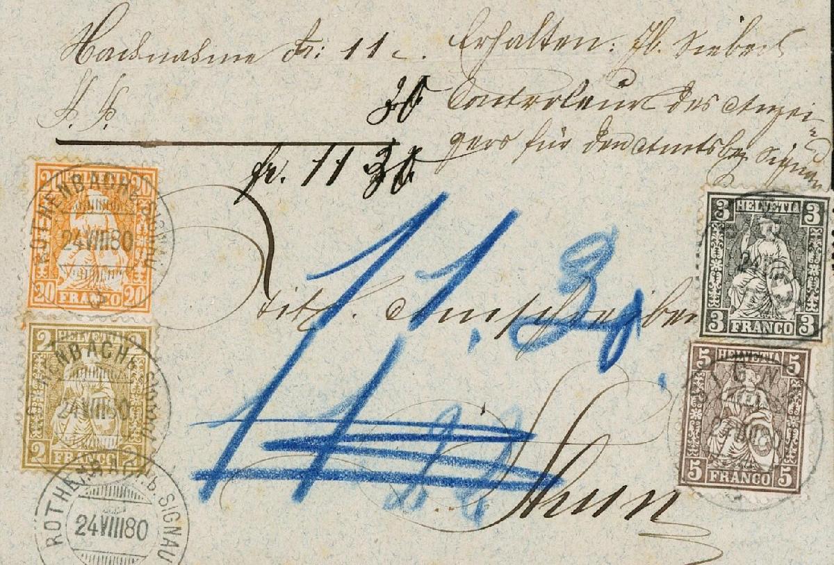 | Zusatzinformationen und Suchstichworte: | Briefmarken Helvetia 46. Live-Auktion 13. Mai 2023 Los 208 Schweiz Sitzende Helvetia gezähnt 1880: NN-Streifband (hinten offen) mit 22 Rp. Frankatur, perfekt entwertet RÖTHENBACH b. SIGNAU nach Thun; in Signau mit 8 Rp. (3 Rp. schwarz, und 5 Rp. braun) zufrankiert; Drucksachenporto nicht akzeptiert und auf 30 Rp. orrigiert; saubere und seltene Vierfarbenfrankatur! Attest Eichele Zuschlag 400,00 CHF |