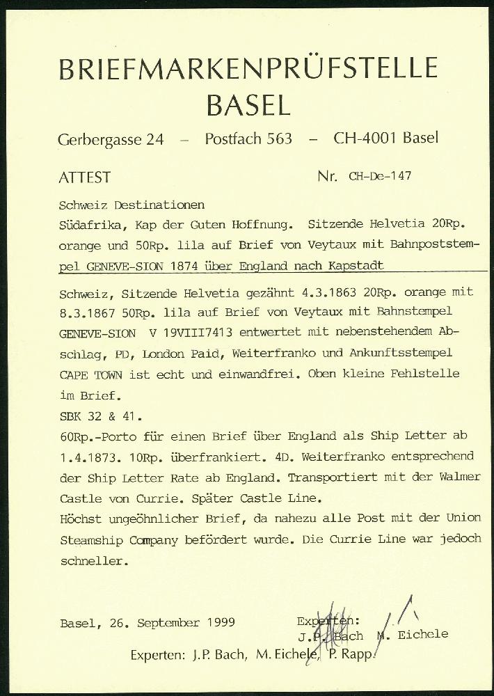 | Zusatzinformationen und Suchstichworte: | Briefmarken Helvetia 46. Live-Auktion 13. Mai 2023 Los 222 Schweiz 1874: 20 Rp. orange und 50 Rp. helllila, auf vollständigem Beleg nach Kap der guten Hoffnung (Südafrika) via Basel, London und Dartmouth; entwertet mit Bahnpost-Stempel GENEVE-SION 19.VIII.74, einen Monat später (21. Sept.) in Capetown eingetroffen; ein paar Transportspuren sind in Anbetracht der Seltenheit dieses Briefes zu vernachlässigen; 2 Atteste erklären die diversen Besonderheiten und Beförderungswege Ausruf 2.500,00 CHF |