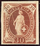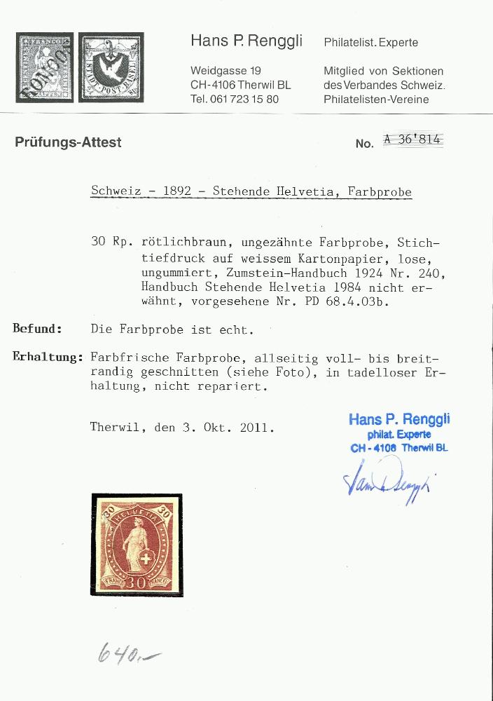 | Zusatzinformationen und Suchstichworte: | Briefmarken Helvetia 46. Live-Auktion 13. Mai 2023 Los 286 Schweiz 30 Rp. rötlichbraun, steh. Helvetia, ungezähnte Farbprobe, ungummiert auf Kartonpapier, Zumstein HB Nr. 240; vollrandig, kl. Schürfung o.r. bei der 30; sauber mit Attest Ausruf 140,00 CHF Renggli. |