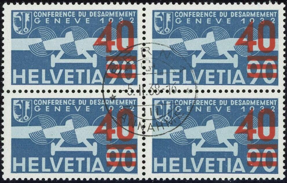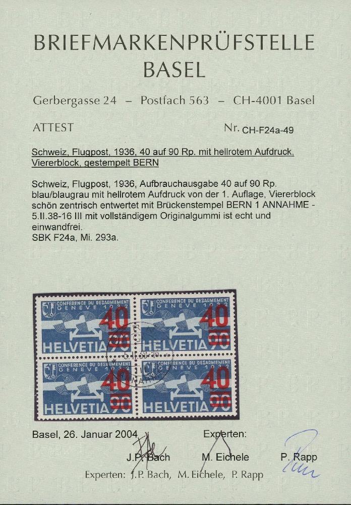 | Zusatzinformationen und Suchstichworte: | Briefmarken Helvetia 46. Live-Auktion 13. Mai 2023 Los 458 Schweiz 1936: 40/90 Rp. mit hellrotem Aufdruck, Viererblock mit Zentrums-Stempel BERN 1 - 5.II.36; tadellos mit Originalgummi; Attest BPB; Kat: 5000.- Ausruf 800,00 CHF |