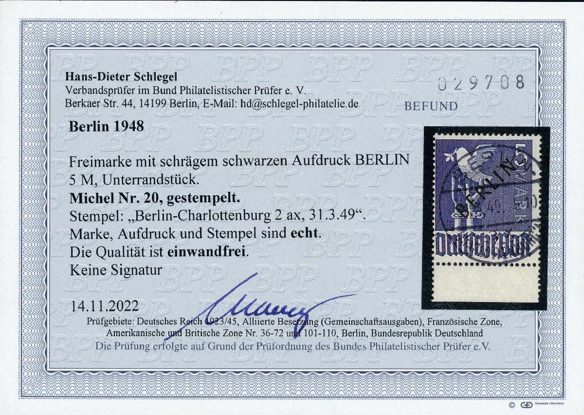 | Zusatzinformationen und Suchstichworte: | Klüttermann - 6. Auktion 27. Juli - 4. August 2023 Los 8802 Berlin 5 Mk. Schwarzaufdr., tadellos zentr. gest. Unterrandstück, FB Schlegel (2022) "einwandfrei" Katalogwert: 750 Ausruf 130,00 EUR |
