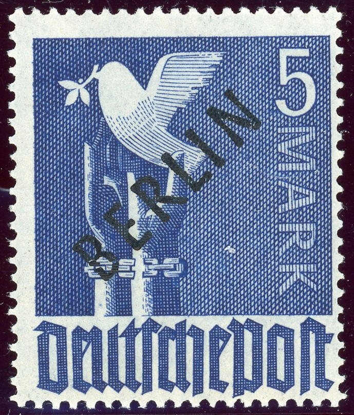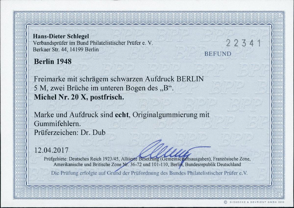 | Zusatzinformationen und Suchstichworte: | Klüttermann - 6. Auktion 27. Juli - 4. August 2023 Los 8806 Berlin 5 Mk. Schwarzaufdr. mit Plf. "B gebrochen", tadellos postfr., Bf Schlegel Katalogwert: 750 Ausruf 150,00 EUR |
