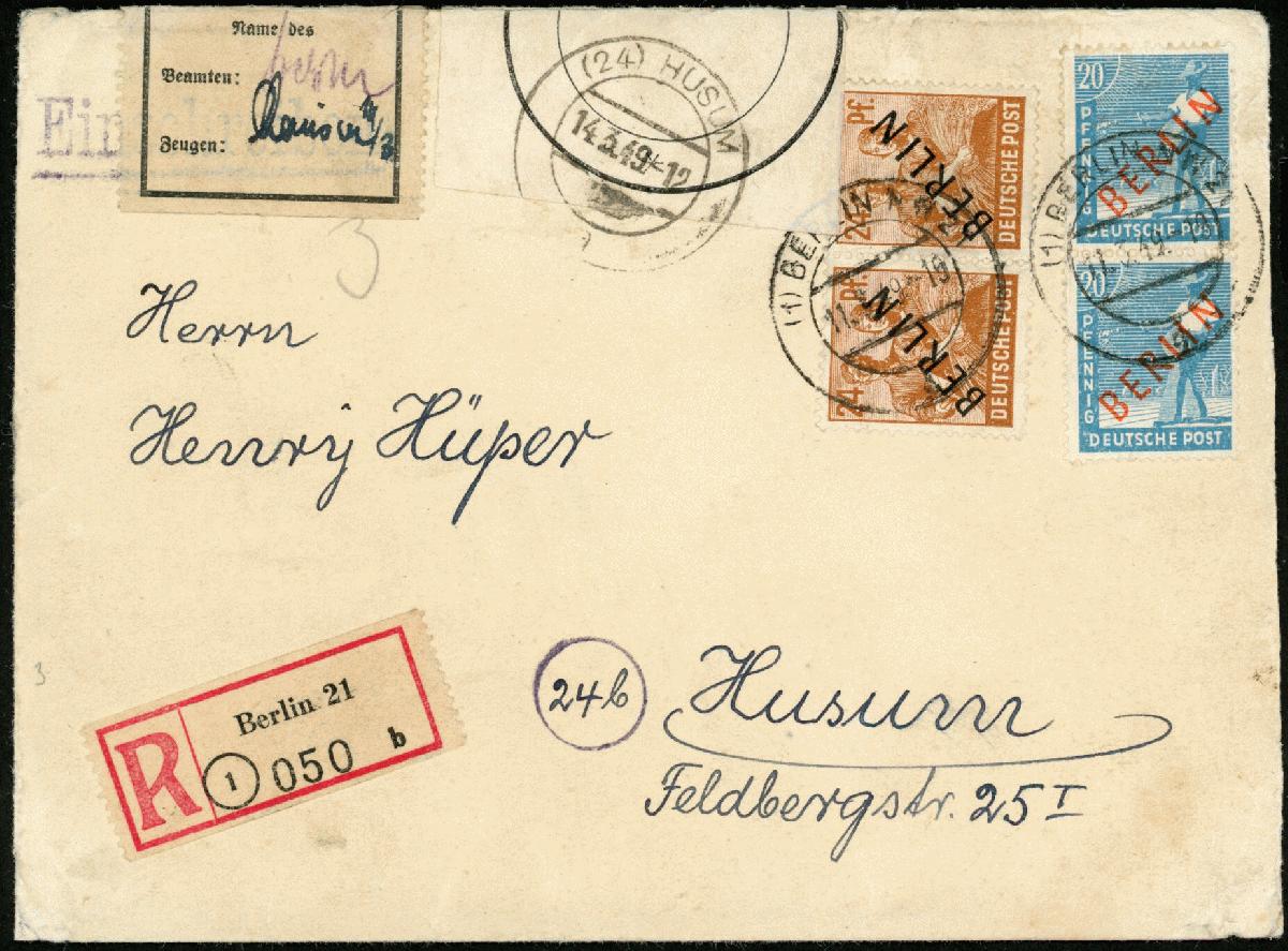 | Zusatzinformationen und Suchstichworte: | Klüttermann - 6. Auktion 27. Juli - 4. August 2023 Los 8837 Berlin 2mal 20 Pfg. Rotaufdr. mit Paar 24 Pfg. SD a. R-Brief 2. Stufe nach Husum ab NW 21 vom 1. Tag des neuen reduzierten R-Portos 11.3.49, beim Transport beschädigt und beim Postamt Husum wieder verschlossen, FA Schlegel Ausruf 240,00 EUR |