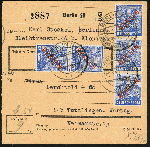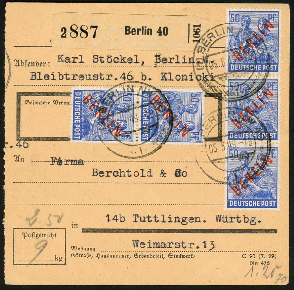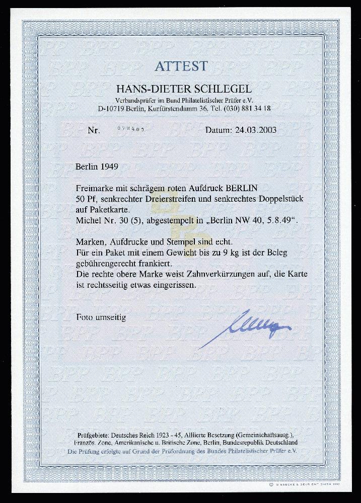 | Zusatzinformationen und Suchstichworte: | Klüttermann - 6. Auktion 27. Juli - 4. August 2023 Los 8848 Berlin 5mal 50 Pfg. Rotaufdruck als sehr seltene portogerechte MeF auf Paketkarte NW 40, eine Marke Zahnverkürzungen und Karte kl. Einriss, FA Schlegel Ausruf 250,00 EUR |